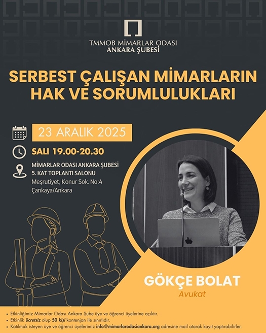 TMMOB Mimarlar Odası Ankara Şubesi tarafından, Mimari Gelişim ve Eğitim Serisi kapsamında TMMOB Mimarlar Odası Ankara Şube Avukatı Gökçe Bolat ile “Serbest Çalışan Mimarların Hak ve Sorumlulukları” konu başlıklı seminer 23 Aralık 2025 Salı günü 19.00-20.30 saatleri arasında Mimarlar Odası 5. kat Toplantı Salonunda gerçekleştirilecektir.