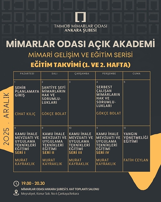 Mimarlar Odası Ankara Şubesi Açık Akademi Aralık Ayı 1. ve 2. Haftası Eğitim Takvimi